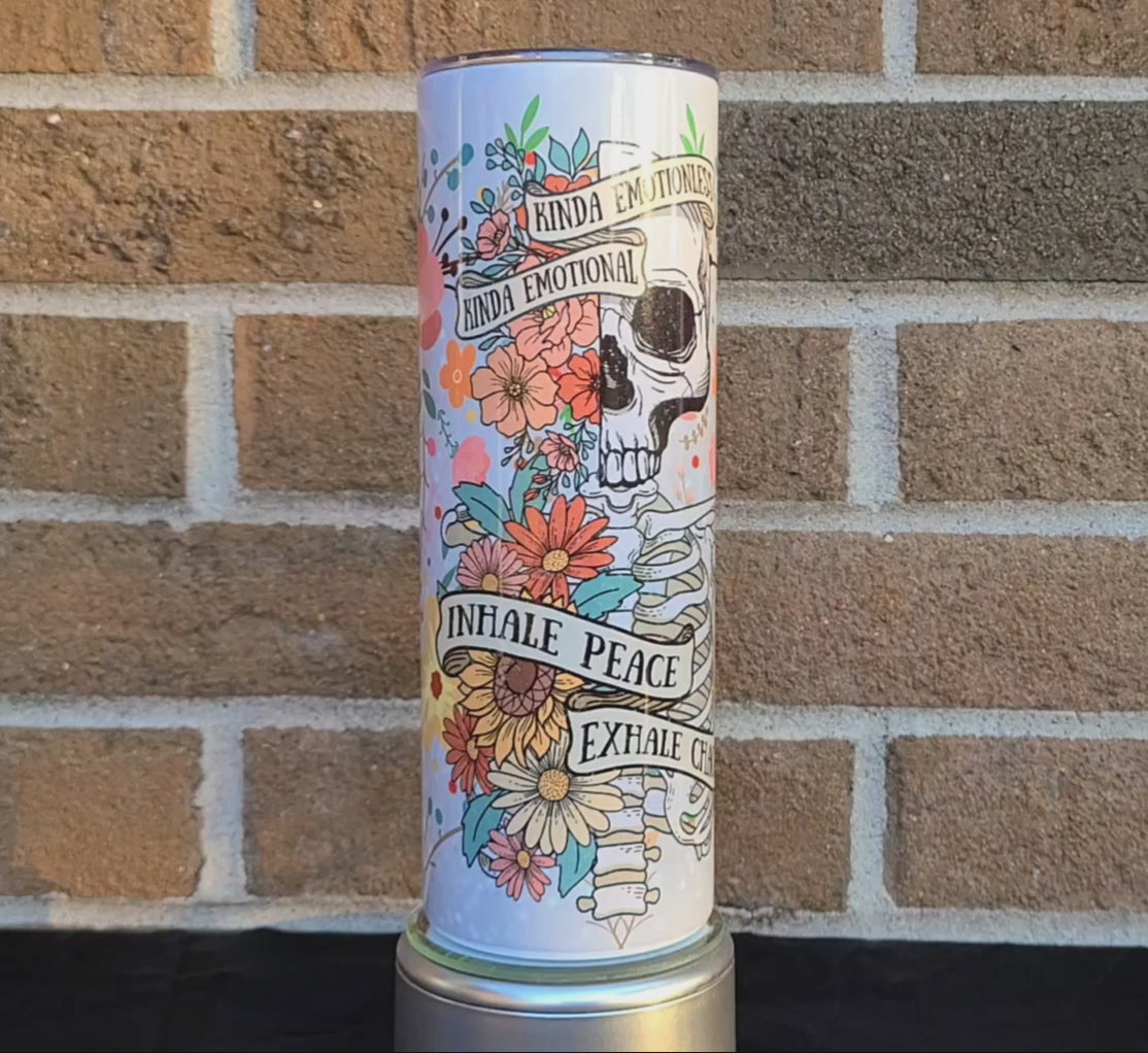 This tumbler blends beauty and edge with a half-floral, half-exposed skeleton design. Featuring the sayings 'Kinda Emotionless, Kinda Emotional' and 'Inhale Peace, Exhale Chaos,' it's made for those who find peace in the middle of chaos.