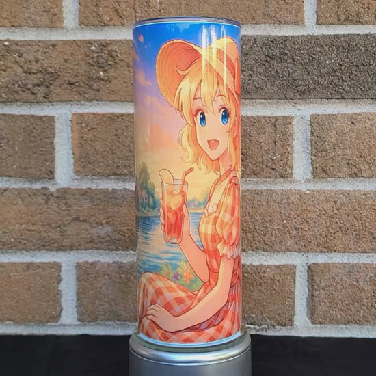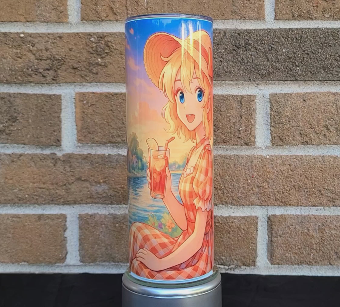 Bright, warm, and full of charm, this anime-style tumbler captures the perfect slow afternoon. Featuring a smiling character, colorful gardens, cozy homes, and a calm waterfront under a golden sunset, it’s a sip of sunshine you can take anywhere