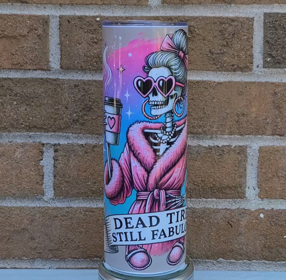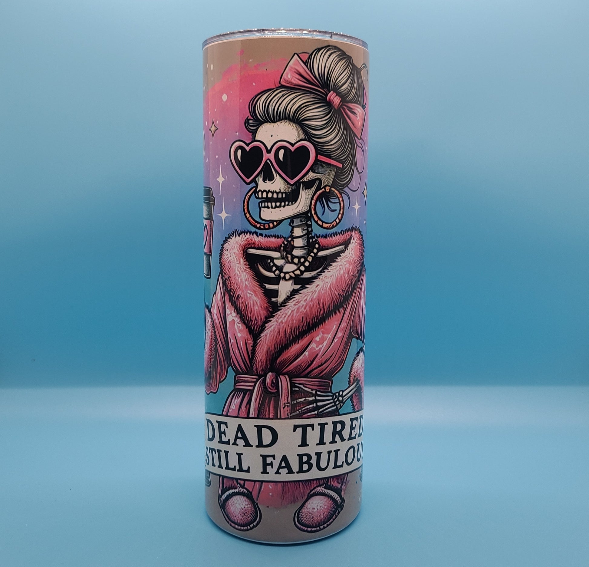 Running on caffeine and attitude? Same. This tumbler features a glam skeleton wrapped in a fluffy pink robe, rockin' pearls and heart-shaped shades while sipping that survival juice — all set against a dreamy pastel cosmic swirl. Because even when you're dead tired... you’re still fabulous.